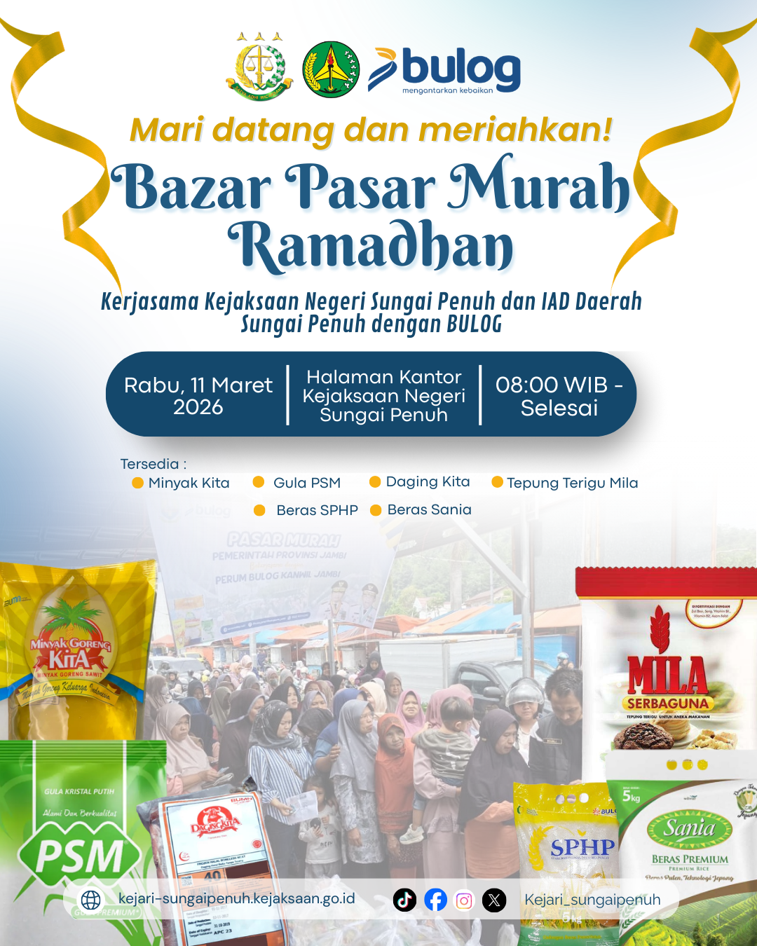 Dalam rangka menjaga stabilitas harga pangan dan membantu memenuhi kebutuhan pokok masyarakat menjelang bulan suci Ramadhan, Kejaksaan Negeri Sungai Penuh dan IAD Daerah Sungai Penuh bekerja sama dengan Perum BULOG menyelenggarakan: