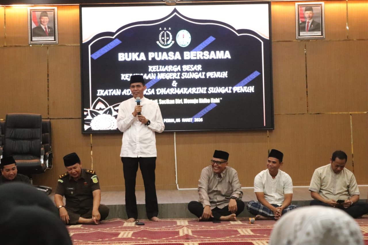 Pada hari ini Kamis, 05 Maret 2026 telah dilaksanakan kegiatan Buka Bersama Keluarga Besar Kejaksaan Negeri Sungai Penuh yang bertempat di Aula Kejaksaan Negeri Sungai Penuh dan dipimpin langsung oleh Kepala Kejaksaan Negeri Sungai Penuh Bapak Robi Harianto, S.H., M.H. bersama para Kepala Seksi (Kasi), Kepala Sub Bagian Tata Usaha/Kasubsi, seluruh pegawai, pegawai honorer, serta Ibu-ibu Ikatan Adhyaksa Dharmakarini (IAD) Daerah Sungai Penuh. Kegiatan ini dilaksanakan sebagai bentuk mempererat tali silaturahmi dan kebersamaan di lingkungan Kejaksaan Negeri Sungai Penuh dalam momentum bulan suci Ramadhan.