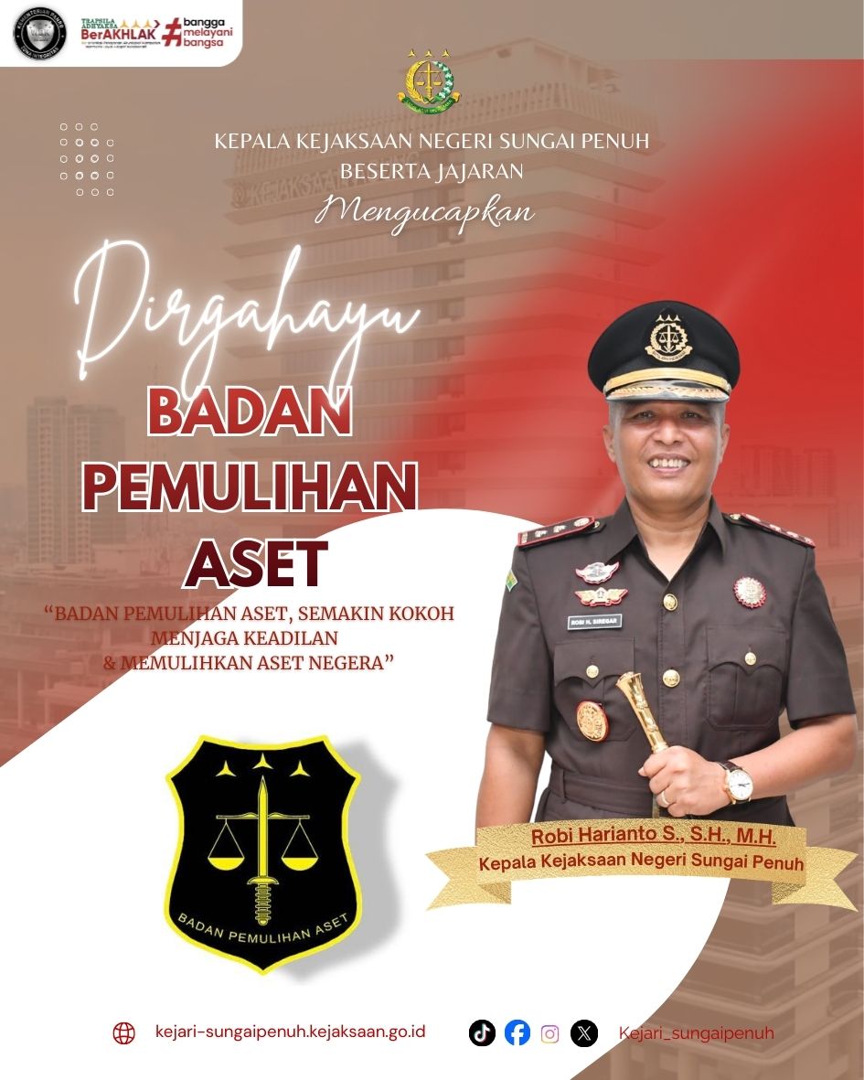 Kepala Kejaksaan Negeri Sungai Penuh beserta seluruh jajaran mengucapkan Dirgahayu Bidang Badan Pemulihan Aset Kejaksaan Republik Indonesia . Dengan mengusung semangat “Semakin kokoh menjaga keadilan & Pemulihan Aset Negara” serta memberikan kontribusi nyata bagi kemakmuran rakyat dan kepercayaan publik.