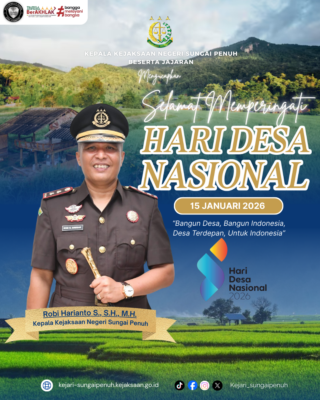 Kepala Kejaksaan Negeri Sungai Penuh beserta seluruh jajaran mengucapkan Selamat Memperingati Hari Desa Nasional Tahun 2026 yang diperingati pada 15 Januari 2026 dengan tema “Bangun Desa, Bangun Indonesia, Desa Terdepan untuk Indonesia”, sebagai momentum untuk memperkuat peran desa sebagai garda terdepan pembangunan nasional demi terwujudnya Indonesia yang maju, berdaulat, dan sejahtera.