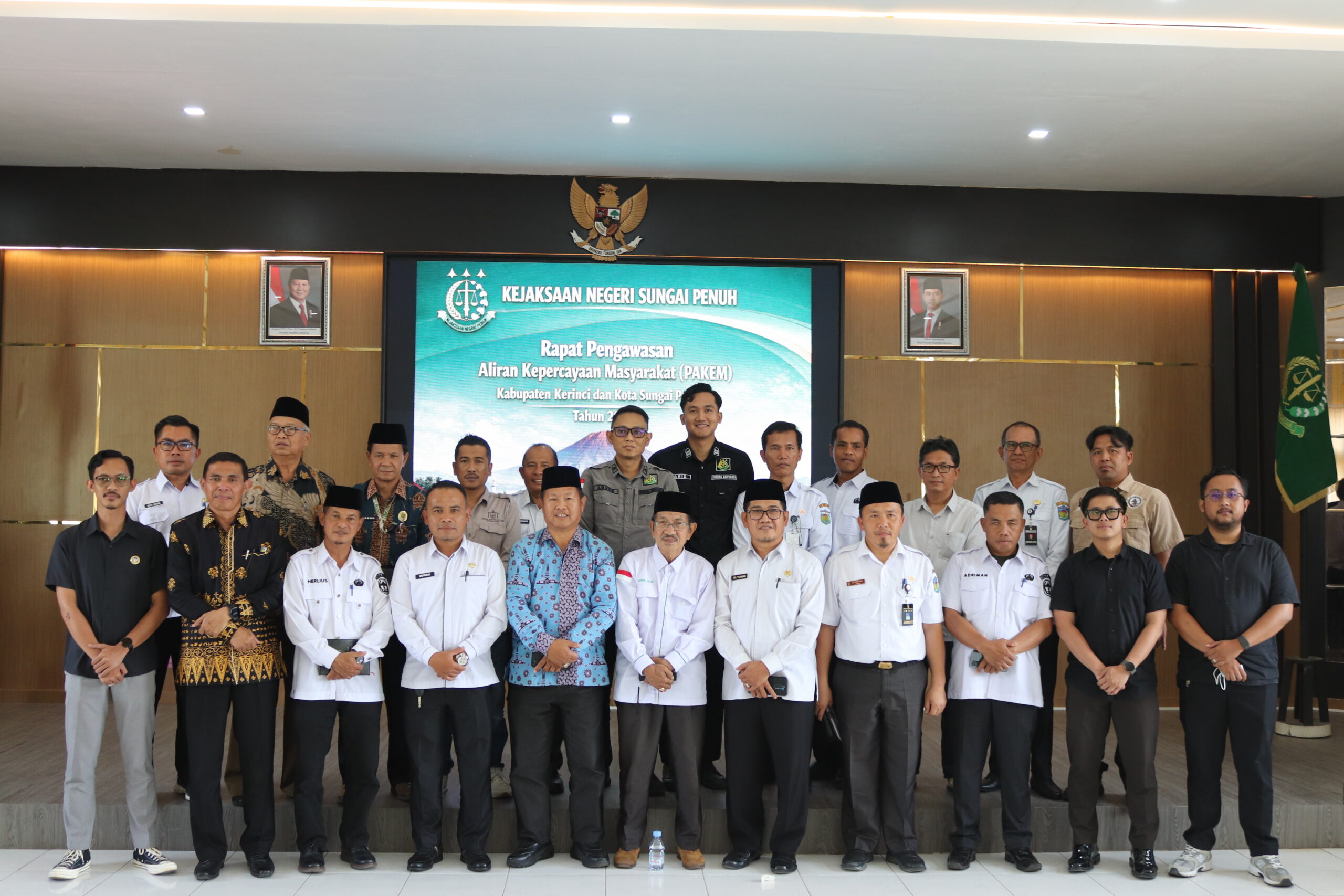 Pada Rabu, 11 Februari 2026, Kejaksaan Negeri Sungai Penuh melaksanakan Rapat Pengawasan Aliran Kepercayaan dan Keagamaan Masyarakat PAKEM Kabupaten Kerinci dan Kota Sungai Penuh. Berdasarkan hasil rapat koordinasi, kondisi kerukunan umat beragama di Kabupaten Kerinci dan Kota Sungai Penuh secara umum dalam keadaan aman dan kondusif meskipun terdapat beberapa aliran kepercayaan yang berkembang tanpa menimbulkan konflik terbuka. Kementerian Agama, Majelis Ulama Indonesia, Forum Kerukunan Umat Beragama, Kesbangpol, Polres, BINDA, serta lembaga adat telah mengaktifkan tim deteksi dini hingga tingkat kecamatan untuk melakukan pemantauan dan pembinaan, khususnya di wilayah Kayu Aro yang menjadi perhatian karena adanya rumah yang difungsikan sebagai tempat ibadah, keberadaan paham menyimpang termasuk yang meragukan kenabian Nabi Muhammad SAW dan praktik ibadah yang tidak sesuai ajaran umum, dugaan upaya pemurtadan di beberapa titik, serta aktivitas penggalangan dana yang perlu diawasi. Hingga saat ini tidak terdapat laporan krusial yang memerlukan penindakan hukum segera dan pendekatan yang ditempuh masih bersifat persuasif melalui edukasi dan dialog guna menjaga stabilitas sosial serta mencegah potensi konflik di kemudian hari.