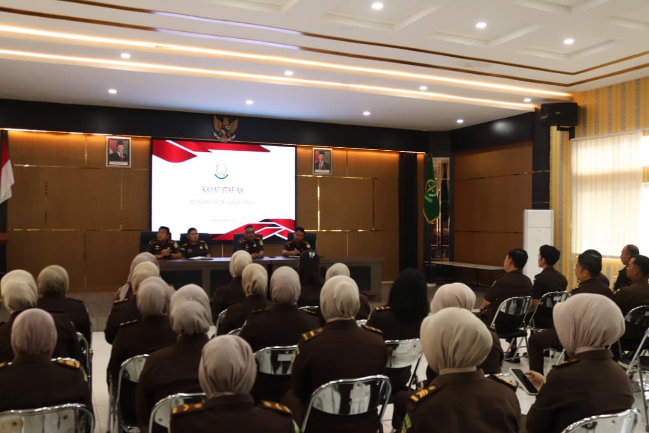Kepala Kejaksaan Negeri Sungai Penuh, Bapak Robi Harianto S., S.H. M.H., memimpin kegiatan Rapat Staf AA yang berlangsung pada hari Senin, 6 April 2026, bertempat di Aula Kantor Kejaksaan Negeri Sungai Penuh. Agenda ini dihadiri secara lengkap oleh para Kasi, Kasubagbin, Kaur, para Jaksa, serta seluruh pegawai hingga tenaga honorer di lingkungan kerja tersebut. Pertemuan ini diselenggarakan sebagai wadah evaluasi kinerja rutin dan koordinasi internal, guna memastikan seluruh program kerja serta pelayanan hukum kepada masyarakat dapat berjalan dengan lebih maksimal, profesional, dan terintegrasi antar setiap bidang kerja di Kejaksaan Negeri Sungai Penuh.