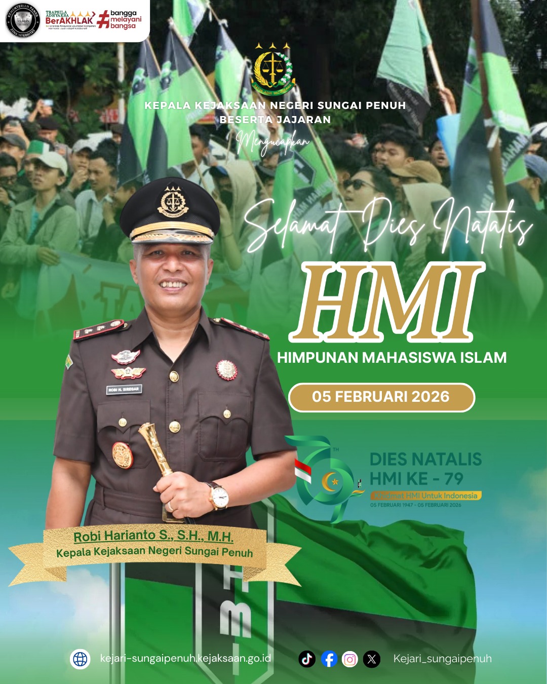 Kepala Kejaksaan Negeri Sungai Penuh beserta seluruh jajaran mengucapkan Selamat Dies Natalis Himpunan Mahasiswa Islam (HMI) yang ke-79, 05 Februari 2026. Semoga HMI senantiasa konsisten dalam khidmat perjuangan, berperan aktif mencetak kader intelektual yang berintegritas, serta terus berkontribusi nyata bagi kemajuan umat, bangsa, dan negara demi terwujudnya Indonesia yang adil, makmur, dan berkeadilan sosial.