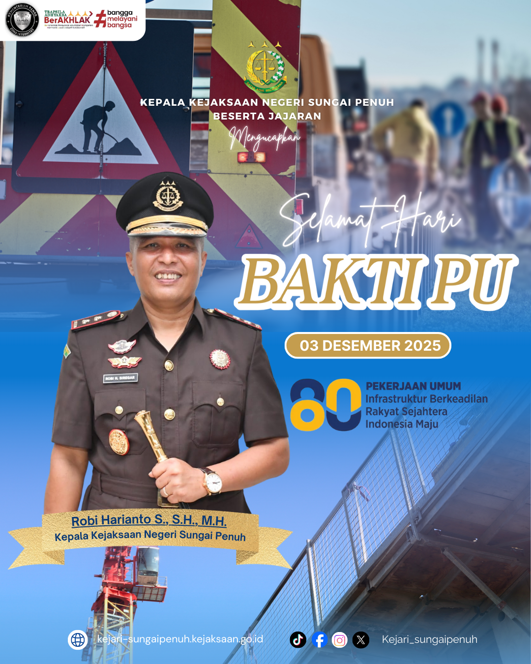 Kejaksaan Negeri Sungai Penuh beserta jajaran mengucapkan Selamat Hari Bakti PU ke-80, 03 Desember 2025. Semoga insan Pekerjaan Umum terus berkomitmen menghadirkan infrastruktur yang berkeadilan, berkualitas, dan memberi manfaat sebesar-besarnya bagi kesejahteraan masyarakat. Terima kasih atas dedikasi dan pengabdian dalam membangun Indonesia yang maju.