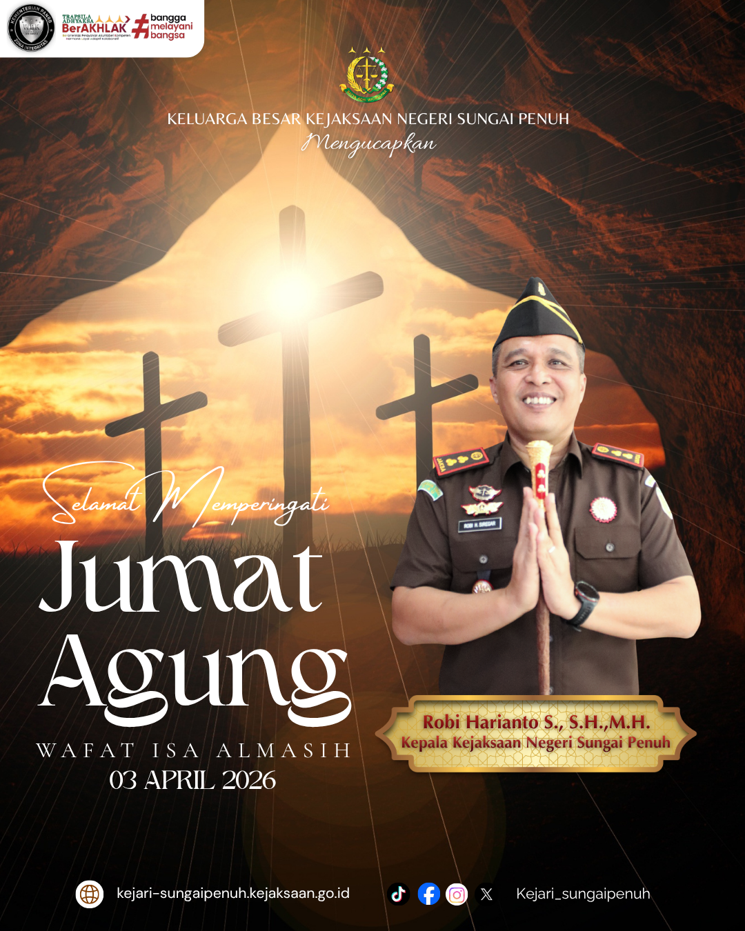 Memperingati Jumat Agung 03 April 2026 keluarga besar Kejaksaan Negeri Sungai Penuh mengucapkan selamat memperingati wafat Isa Almasih kepada seluruh umat Kristiani Semoga momentum suci ini menjadi pengingat akan kasih pengorbanan dan pengharapan yang membawa kedamaian keteguhan iman serta semangat untuk menebarkan kebaikan dalam kehidupan sehari hari