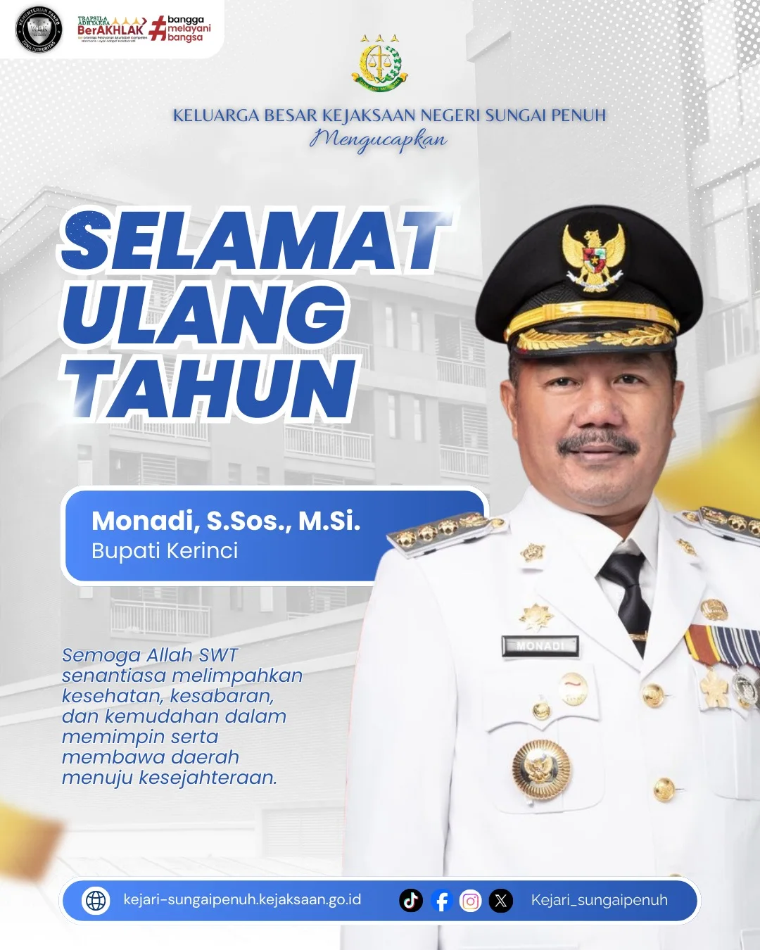 Segenap Keluarga Besar Kejaksaan Negeri Sungai Penuh mengucapkan Selamat Ulang Tahun kepada Bupati Kerinci, Monadi, S.Sos., M.Si. Semoga senantiasa diberikan kesehatan, kekuatan, dan kebijaksanaan dalam memimpin, serta terus membawa Kabupaten Kerinci menuju kemajuan dan kesejahteraan masyarakat. Semoga pengabdian yang diberikan menjadi ladang amal dan membawa kebaikan bagi daerah yang kita cintai bersama.