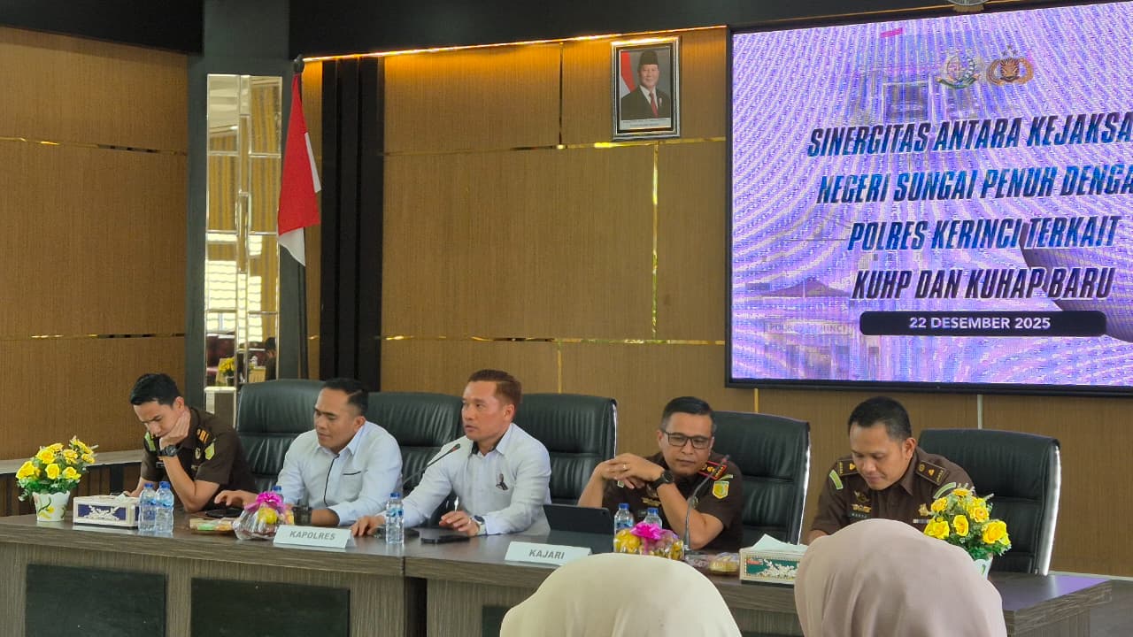 Pada Senin, 22 Desember 2025, Kejaksaan Negeri Sungai Penuh bersama Polres Kerinci melaksanakan kegiatan sinergitas dan koordinasi yang membahas perubahan norma, mekanisme, serta implikasi yuridis dari KUHP dan KUHAP Baru. Kegiatan ini dipimpin langsung oleh Kepala Kejaksaan Negeri Sungai Penuh dan dihadiri oleh jajaran Kejaksaan serta perwakilan Polres Kerinci, sebagai wujud komitmen bersama dalam menyamakan persepsi, meningkatkan efektivitas koordinasi, serta mencegah perbedaan penafsiran hukum. Melalui forum ini diharapkan tercipta kesiapan yang optimal, seragam, dan selaras dalam pelaksanaan tugas penyidikan dan penuntutan di wilayah Kabupaten Kerinci dan Kota Sungai Penuh.